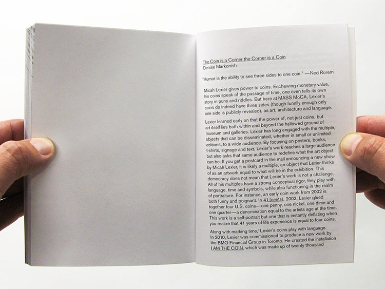 Micah Lexier installed 100 custom-minted coins in 100 corners throughout MASS MoCA—the exhibition spaces, corridors, offices and restrooms. This book includes a photograph of each coin along with a map identifying its permanent location. 5 x 6.75 inches, 208 pages.