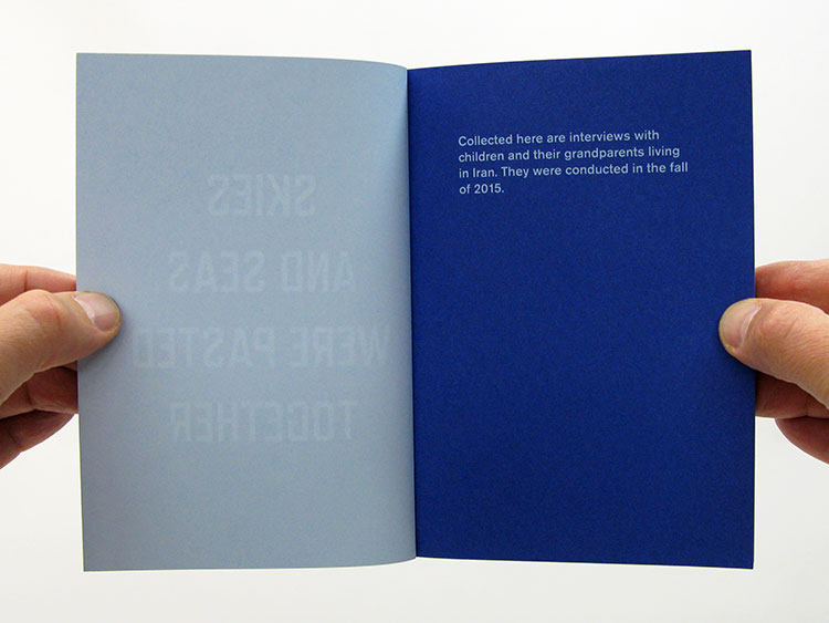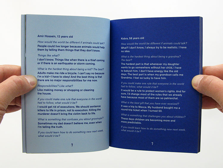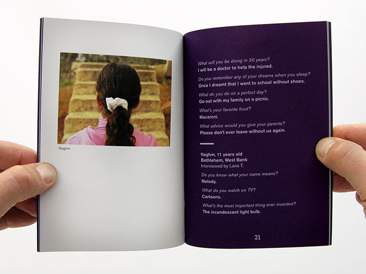 As an extension of Conflict Kitchen, Jon Rubin and Dawn Weleski commission interviewers and photographers to bring us the thoughts of children living in countries with which the United States is in conflict. Books so far include Afghanistan, Palestine (where we couldn’t show any faces), Cuba, and Iran (where we also featured each child’s grandparent). 5 x 7 inches; 28, 40, 56 and 84 pages. More work for Conflict Kitchen is here and here.