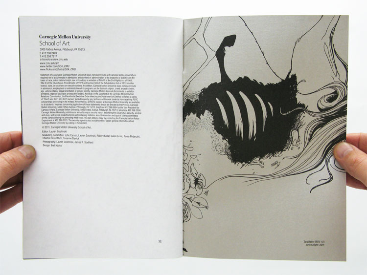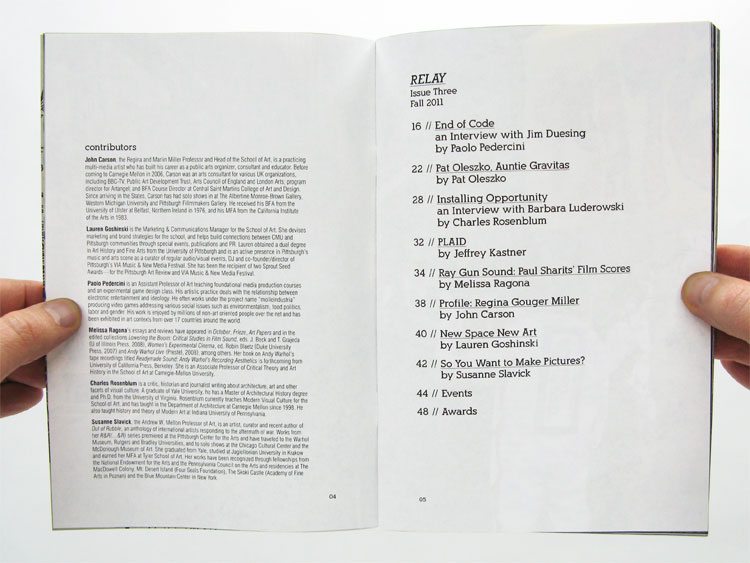 Relay was to be an annual magazine dedicated to the past year at Carnegie Mellon’s School of Art. It only lasted for one issue. The size and cover aesthetic matches the viewbook, since they were often delivered as a set. 6.5 x 9.5 inches, 52 pages.