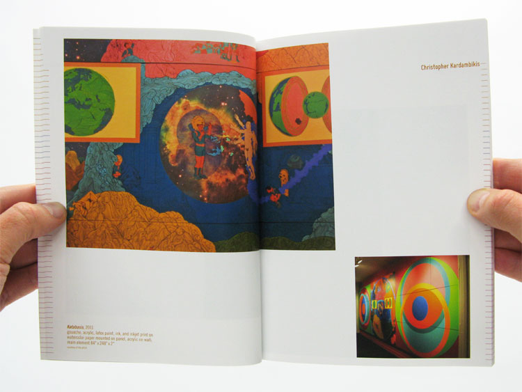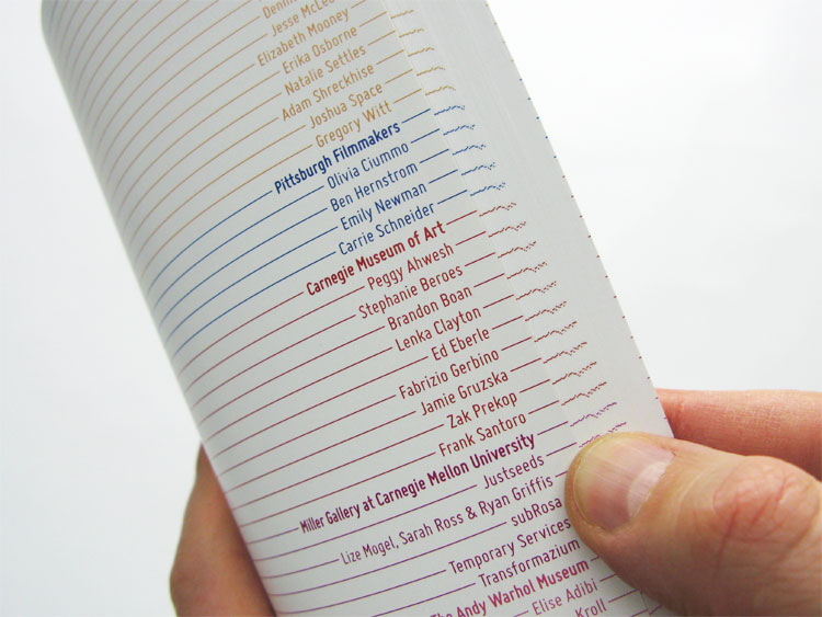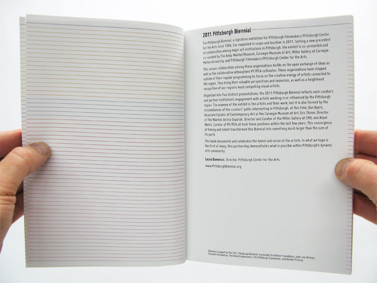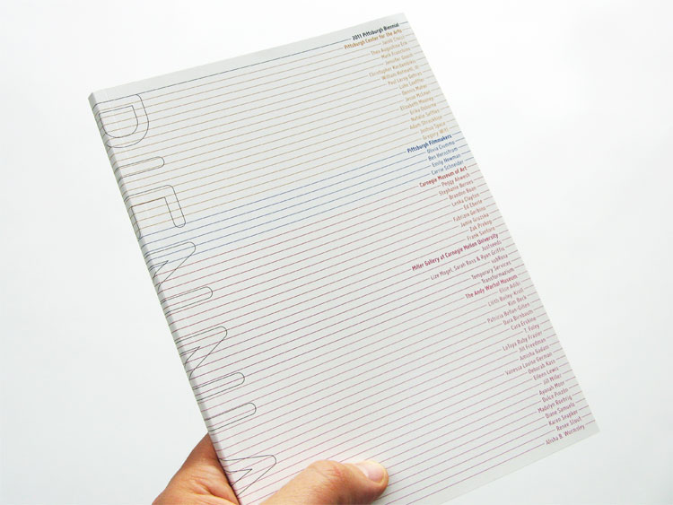 For the first time in its history, the Pittsburgh Biennial expanded beyond Pittsburgh Center for the Arts/Pittsburgh Filmmakers to include Carnegie Museum of Art, The Andy Warhol Museum and Miller Gallery at CMU. I represented the collaboration of five organizations, four curators and 55 artists by putting everyone involved on the cover. Thin lines following each name connect to either a short statement from each curator or a spread of each artist’s work. 6.5 x 9 inches, 124 pages.