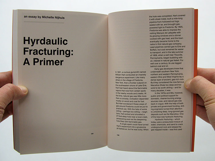 The work of six photographers tells the personal stories of Pennsylvanians affected by the Marcellus Shale gas industry. The photos are presented without captions. Instead, “field notes” (written by each photographer) are given at the end. 6 x 9 inches, 220 pages, with six different covers.