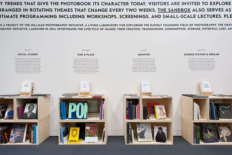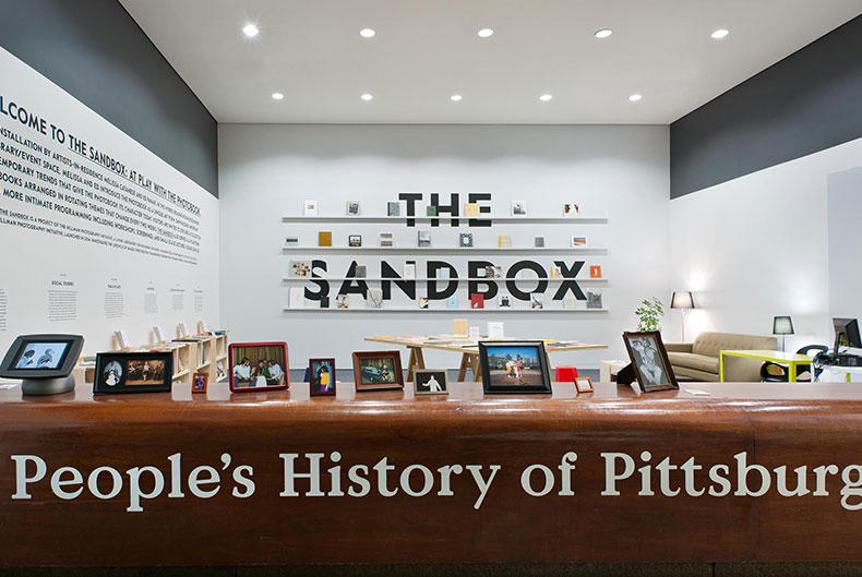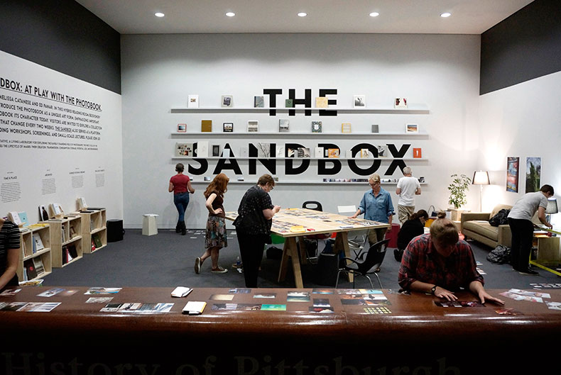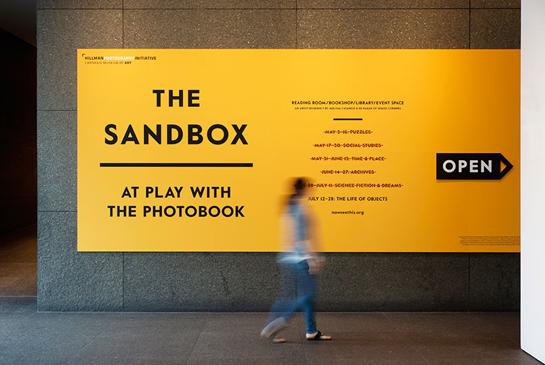 I worked with Melissa Catanese and Ed Panar of Spaces Corners to create this hybrid space for encounters with the photobook as part of the Hillman Photography Initiative. Located in the coatroom of the Carnegie Museum of Art, The Sandbox was part reading room, part bookshop, part library and part event space. And it hosted A People’s History of Pittsburgh, an online project inviting visitors to share images from Pittsburgh’s past (that were then projected onto the wall). I also designed gallery guides for each of the six Sandbox themes and a title wall that was easily updated. Woodwork by Nathan Gearhart.