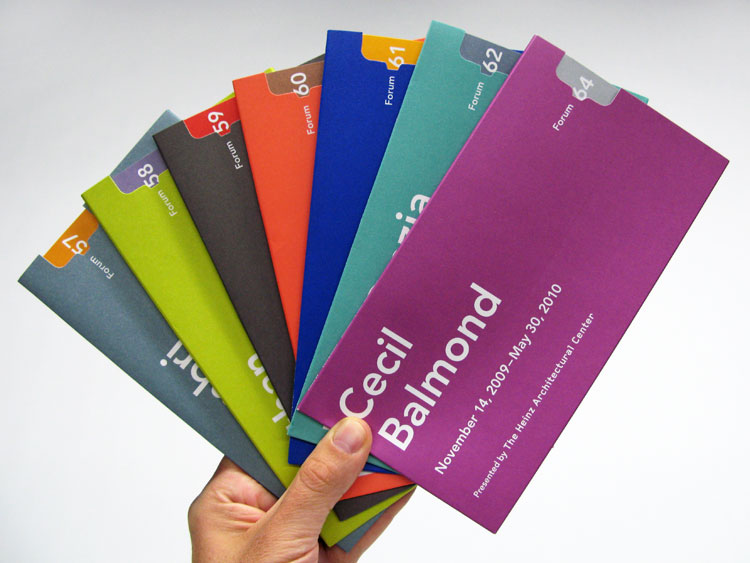 I was asked to redesign the gallery guide format for the Carnegie’s Forum Gallery. In the past, the museum found that people were not taking the guides (even though they were free). A die-cut holder with an accordion-folded insert gives the new guide a perceived value. A consistency in size and typography allows one to build their own Forum library from the four exhibitions held each year. People seem to be taking them. 4.5 x 8.5 inch-sleeve, with a 24 x 8.375-inch folded insert.