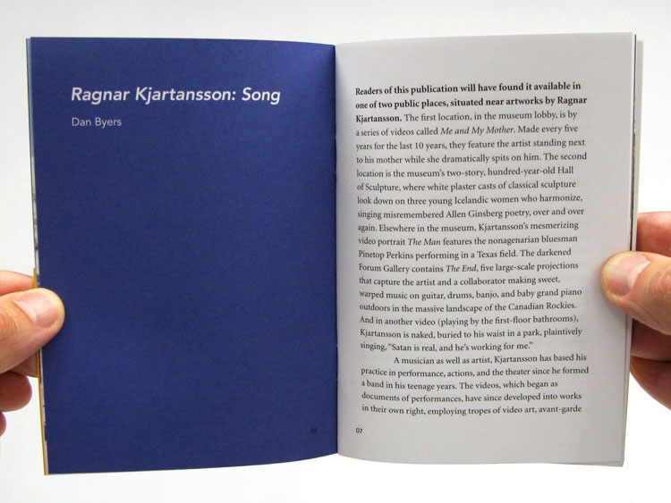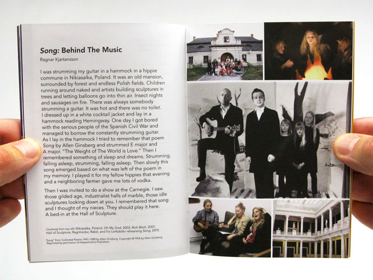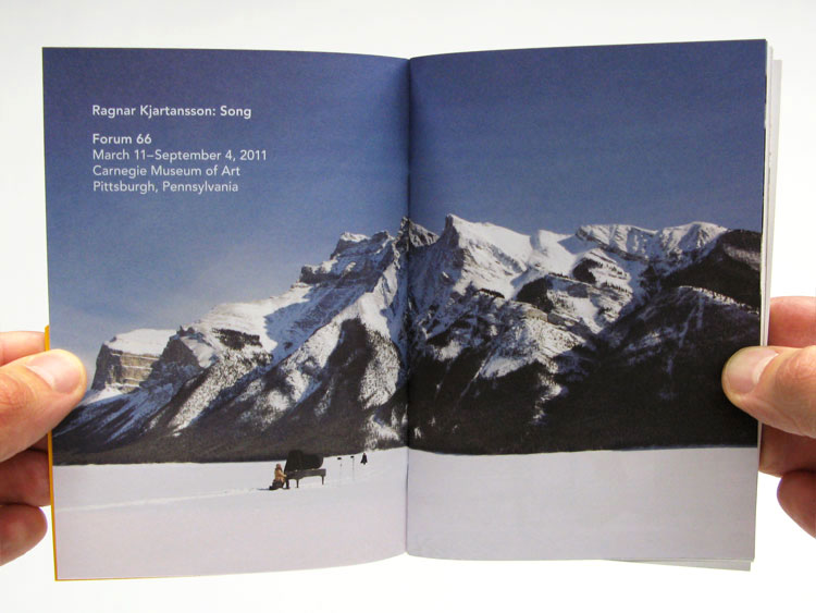 Ragnar Kjartansson’s videos reflect an interest in music and theater and the personae of its performers—often coupled with extreme environments. I tried to replicate his Me and My Mother (where his mother repeatedly spits in his face) on the cover and last pages of the booklet. 4.25 x 6 inches, 48 pages.