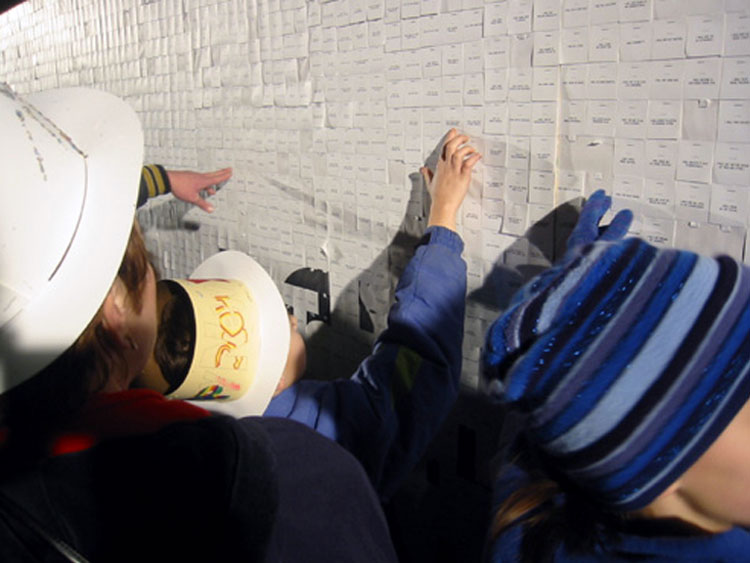 In 2003, my wife, Sarah, and I were asked to do an installation for “First Night,” a New Year’s Eve celebration in downtown Pittsburgh. We built a seven-foot-high by 28-foot-wide wall and covered it with two-inch squares of paper (each held with a single staple). Printed on each square was a different resolution—7,056 in all—for the coming year … “In 2004, I will be a better Dad.” … “In 2004, I will invent a new word.” … “In 2004, I will follow my heart.” … A person could approach the wall, find a resolution they liked, pull it off and “keep it.” Underneath the resolutions—printed onto the wall itself—was one big resolution for all of us. As each small square was removed, this resolution was slowly revealed. Remember, this was 2004. But now—many years later—it’s a resolution I continue to make.