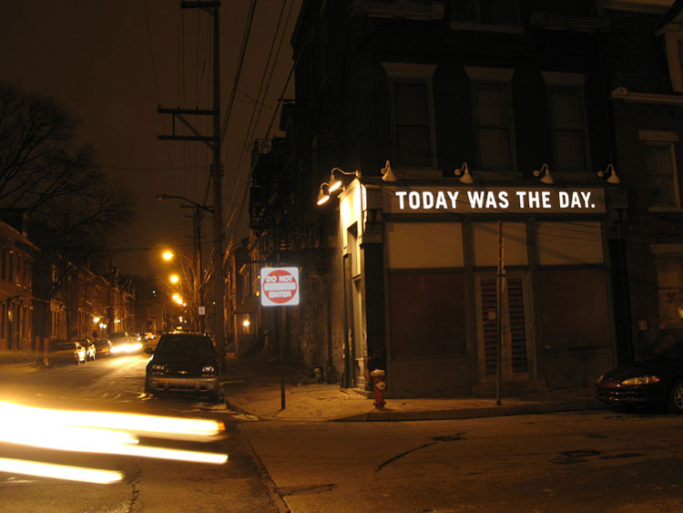 For the Gestures show at Mattress Factory, curator Heather Pesanti asked everyone participating to take inspiration from an essay by Robert Smithson and Mel Bochner about an apocalyptic landscape. I created a lo-tech sign in reflective adhesive vinyl. It’s almost invisible during the day and briefly lights up at night whenever a car drives past—giving everyone who glimpses it a little less to worry about.