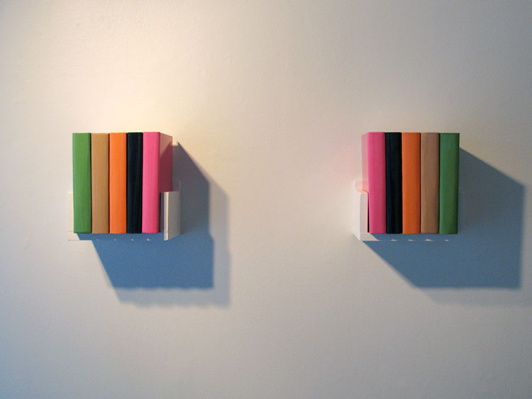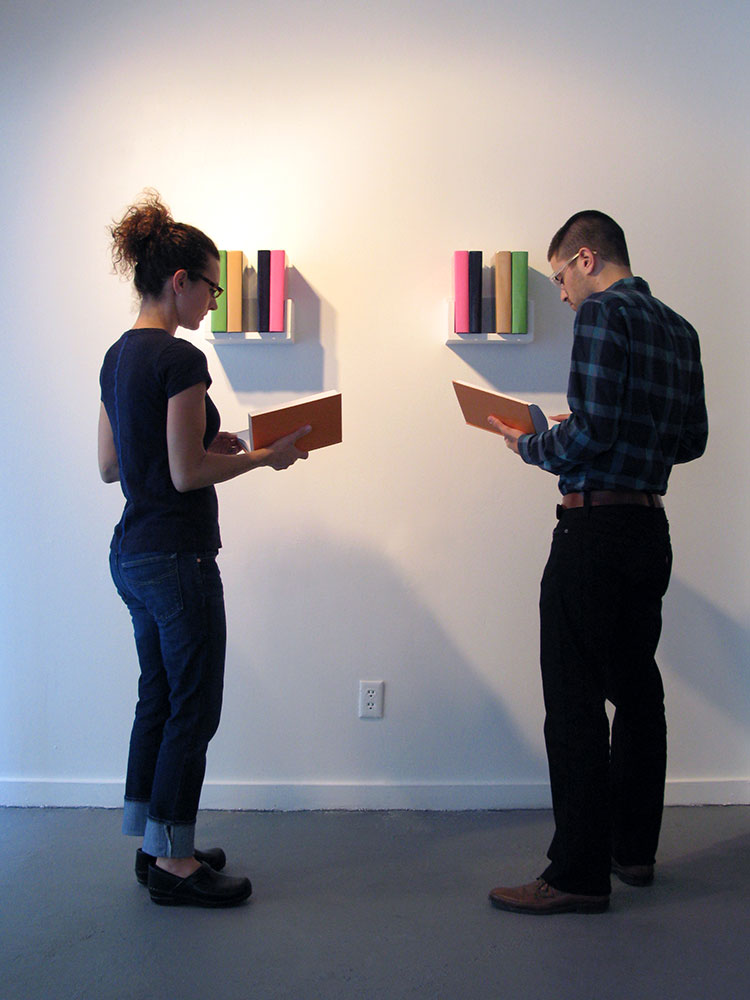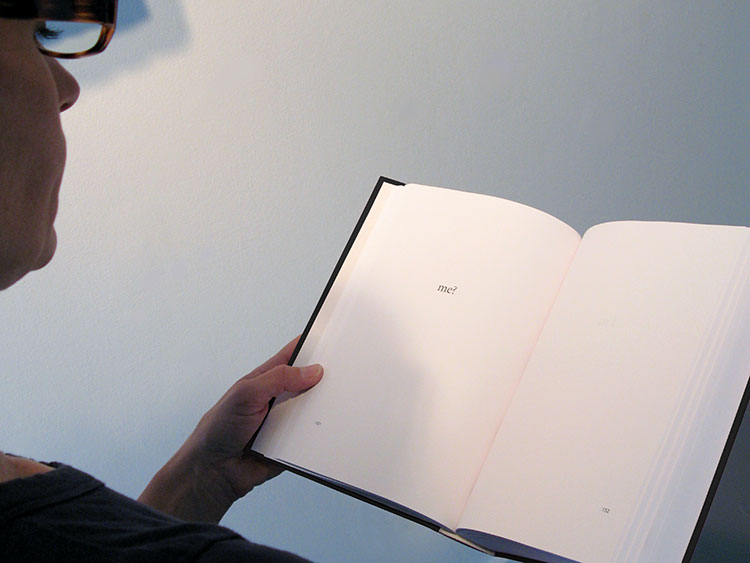 For a show entitled Book at 709 Gallery, I transcribed the complete dialogue of scenes from four movies and one television show from the 1980s that I still remember because they were scenes where the male character is either professing his love to, breaking up with, or being dumped by the female character. Each scene is given a pair of case-bound books with the male’s dialogue on the recto pages and the female’s dialogue on the verso pages—each with one word per page.