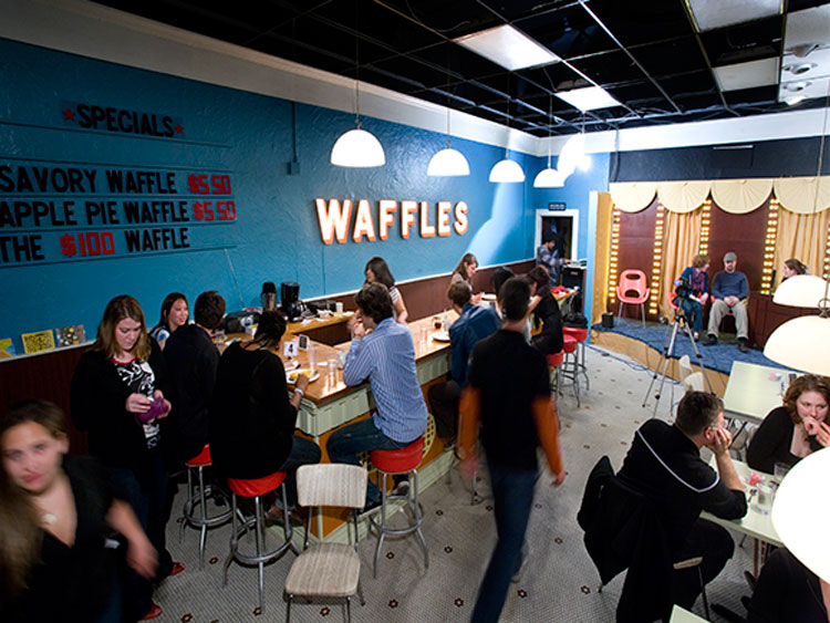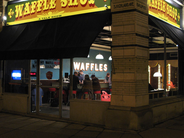 Waffle Shop combined homemade waffles with a weekly, on-site talk show in Pittsburgh’s East Liberty neighborhood. I worked with Jon Rubin and Carnegie Mellon University’s art, design and architecture students to create signage, postcards, posters, t-shirts and the shop’s interior.