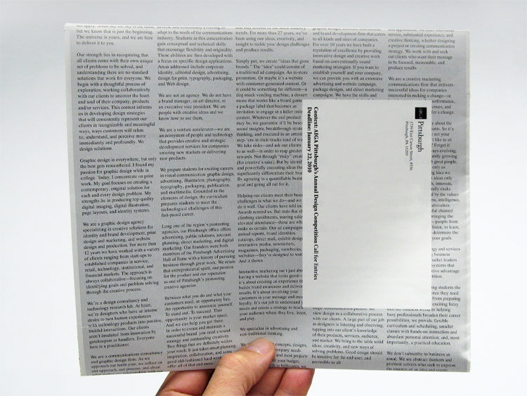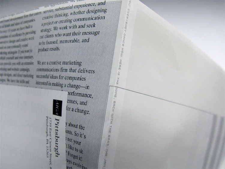For this call for entries to our local design competition, I used the “about us” statement from every design studio in Pittsburgh. It’s interesting to me how similar they are. We’re all just squirrels trying to get a nut. Self-mailer that unfolds into a 28.375 x 24.5-inch poster.